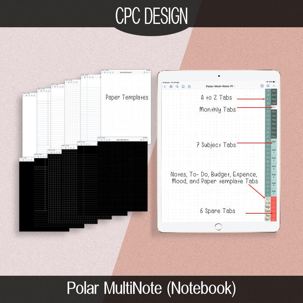 DESCRIPTION✻ COMES WITH FREE STICKER BUNDLE ✻✻ You will need an app such as iZip or Documents 5 to unzip the sticker file,or if you have the latest iPad OS then you can unzip it in the files app.✻ THIS NOTE BOOK IS BLANK AND FOR USE IN PORTRAIT MODEThis Notebook is totally blank and comes with a sticker bundle to get you started. The Polar MultiNote Notebook has an A to Z, Notes, Monthly, Subject,To- Do, Budget, Expense, Mood, and Paper template tabs all hyperlinked, plus there are six numbered tabs to do as you wish. Each tab contains pages that can be duplicated as many times as you need. The pages are a Dot Grid layout for the most part. This little clean notebook is excellent for taking notes in school, college, and university, it can be used as a regular planner using the monthly tabs and can be used anywhere you take your iPad and need to take notes, or organise your day.Whats Included:✻ 1 Polar MultiNote Notebook PDF file✻ 1 Free PNG Sticker Bundle in Zip File✻ 2 Free Sticker Bundle GoodNotes in Zip File✻ The notebook will be downloaded in pdf format.!GoodNotes App not included. (Can buy on Apple AppStore)This can also be used with any app that allows PDF annotations.