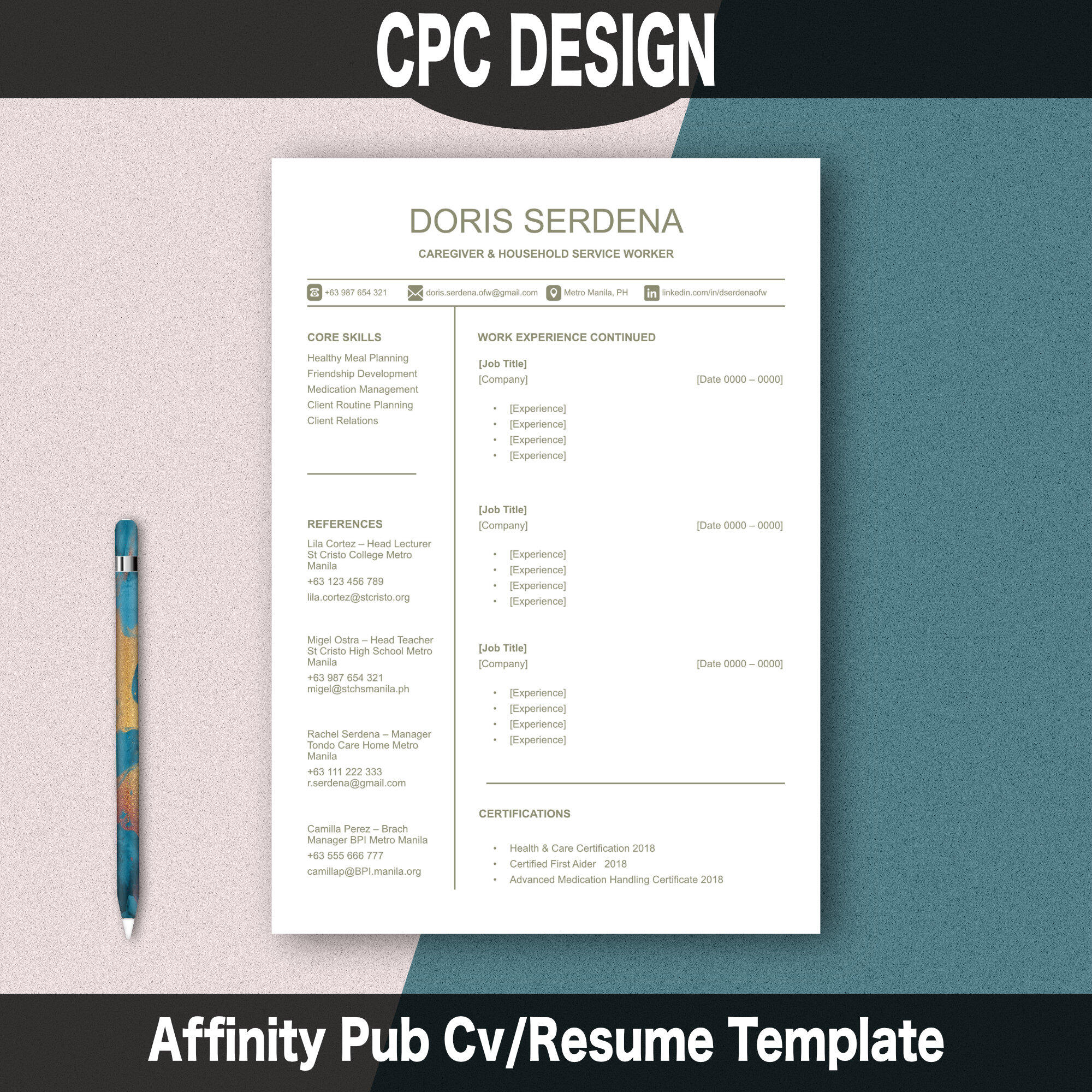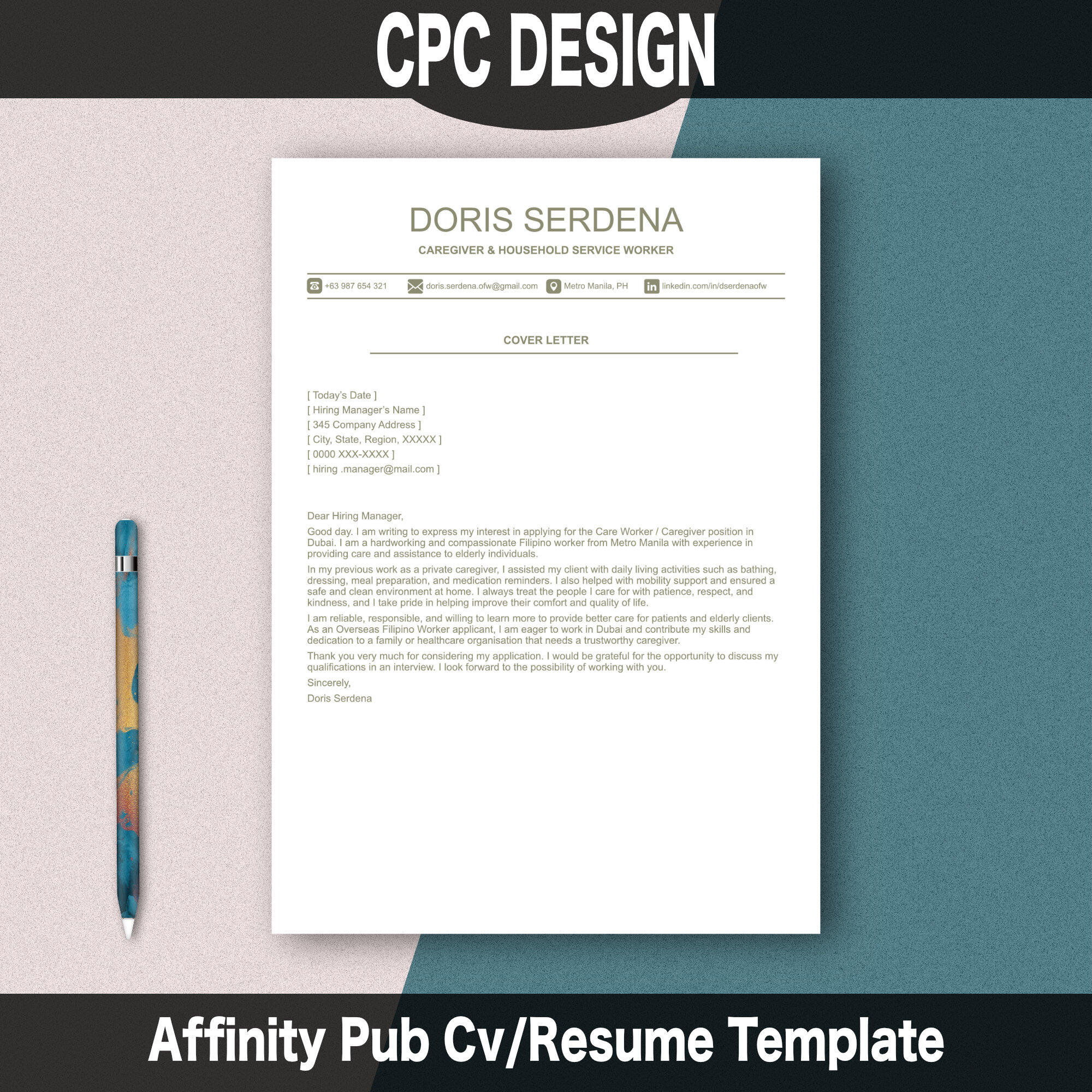 ✻ 2 Pdf Files incase you would rather upload to Canva and edit them there.✻ Fully customizable text, fonts, and colors.✻ Instant digital download.Perfect For:✻ Job seekers, care givers & career professionals.✻ OFW and any foreign workers.✻ Creative and corporate industries.✻ Freelancers & entrepreneurs.✻ College graduates and experienced professionals.Edit this file with your own details export as a pdf, then print or send via e-mail or social message.Clean, modern, and professional layout.Please Note: !!