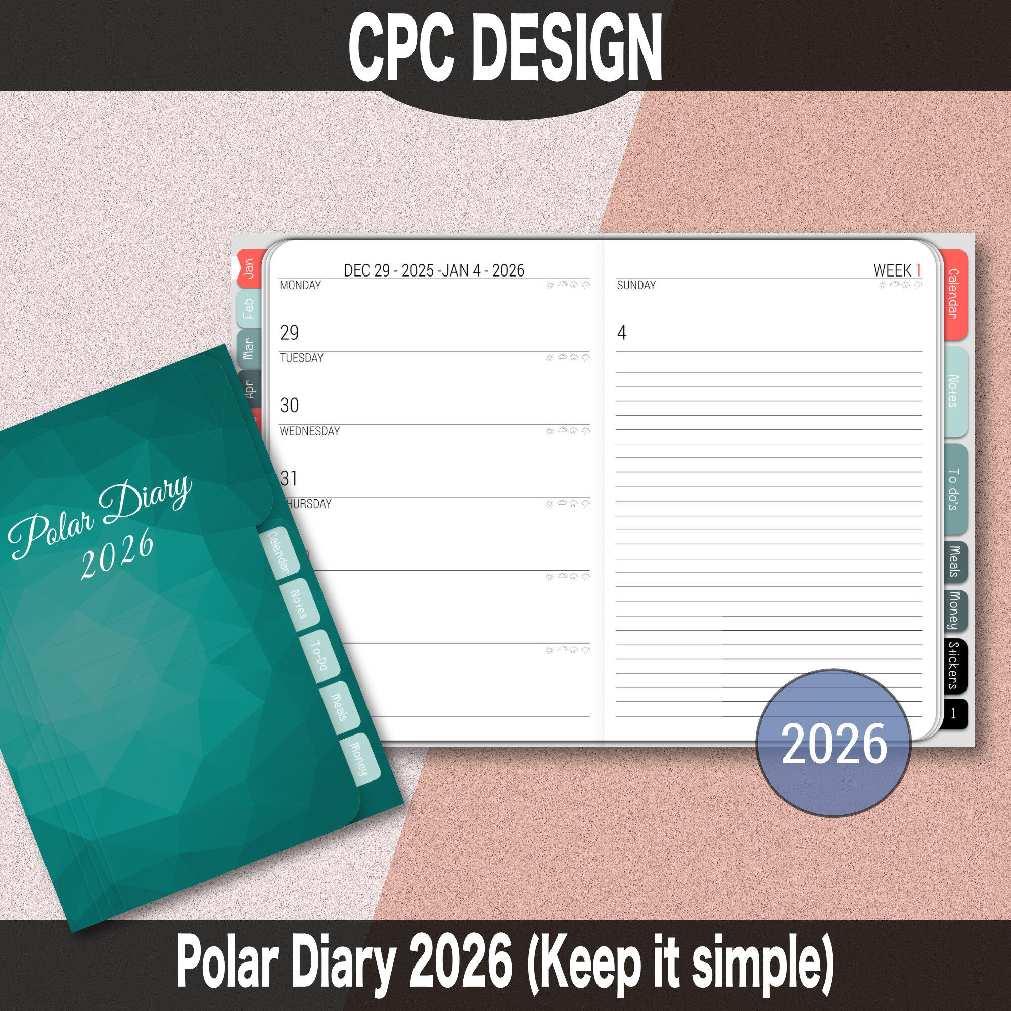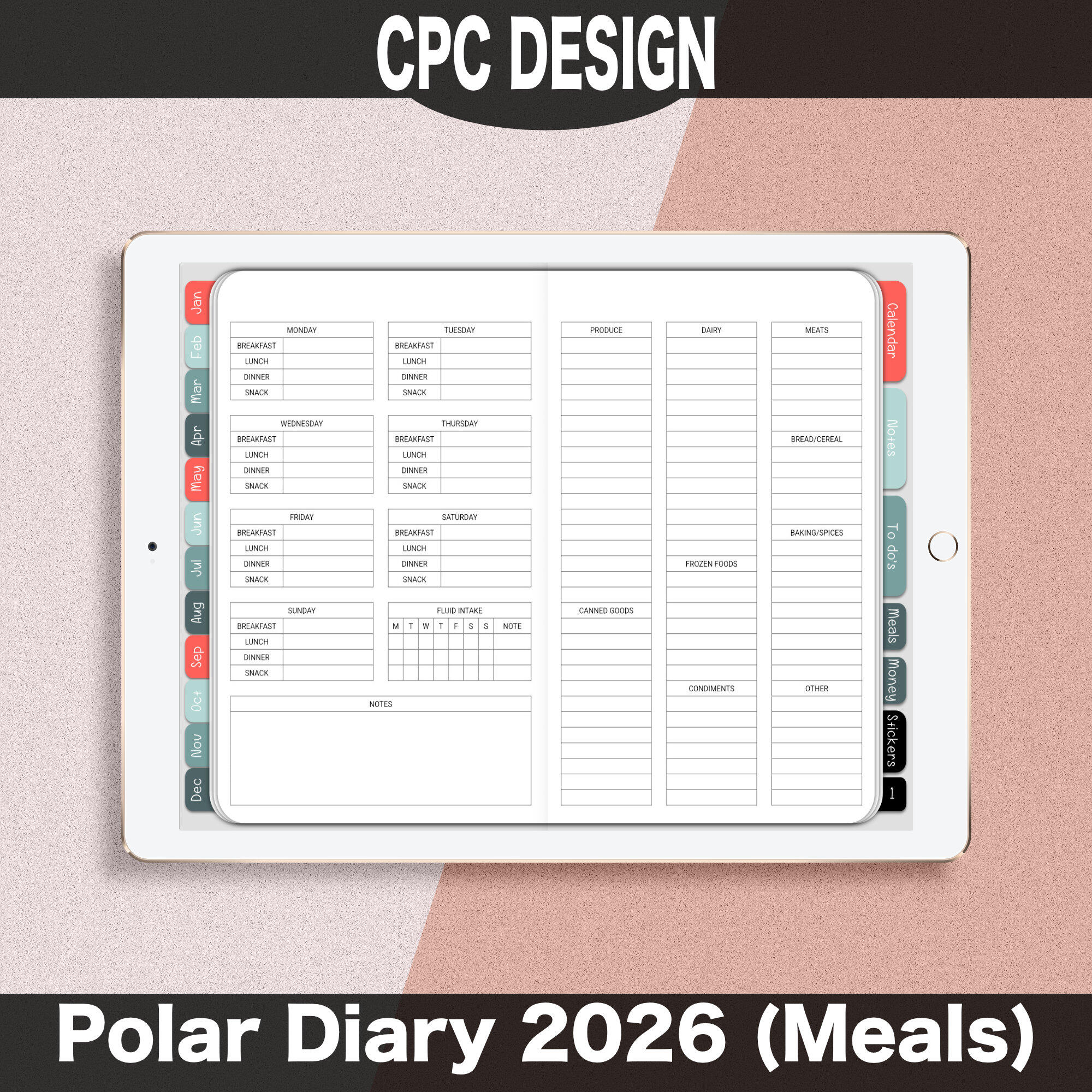 DESCRIPTIONPolar Diary 2026 is a simple and clean weekly digital diary PDF, for use with the GoodNotes app on iPad. Can Be Used on iPad / iPad Pro . The Polar Diary 2026 is an all in one planner for use in your everyday activities. It will replace your paper diary and has Hyperlinked Tabs such as, All Months, Meal Plan & Grocery List, To do’s, Sticker Area, Notes, Year at a glance Calendar.Whats Included:✻ 1 Polar Diary PDF file
